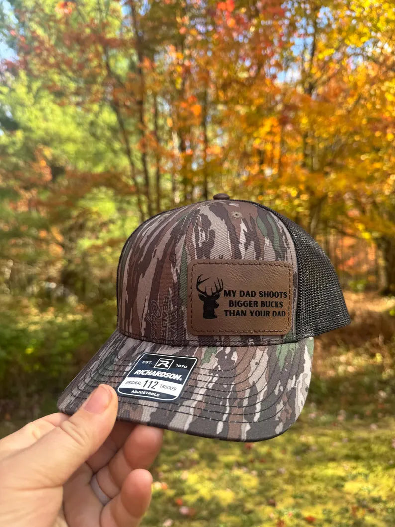 Unleash your young hunter's sense of humor with this custom leather patch pressed on Richardson camo hat. With its adjustable OSFM design, this hat ensures a perfect fit. Made with quality materials, this hat sports a bold yet playful message: "My Dad shoots bigger bucks than your dad."